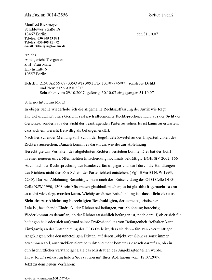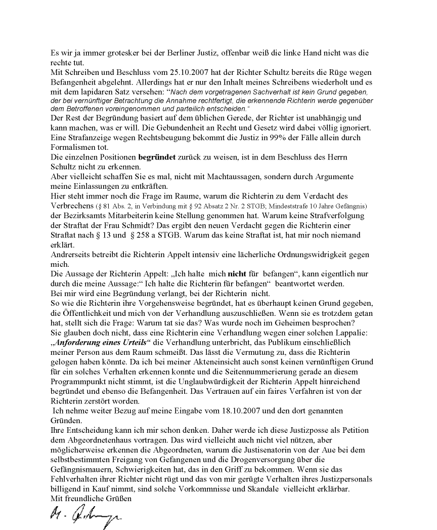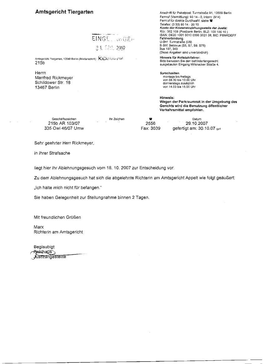 | Nachdem der Richter Schulz meinen Befangenheitsantrag schon mit Beschluss vom 25.10.2007 bereits ohne vollständige Begründung abgelehnt hatte, kommt nun eine Anhörung von der Richterin Marx vom 29.10.2007. Weiß die linke Hand der Justiz nicht was die rechte tut? |