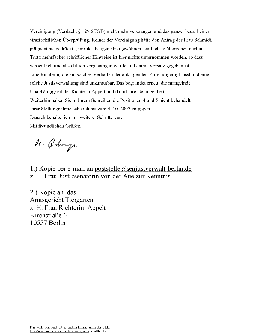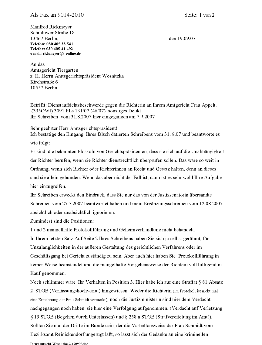 Antwort auf den Brief vom 31.8.2007 des Amtsgerichtspräsidenten Wosnitzka vom Amtsgericht Tiergarten: